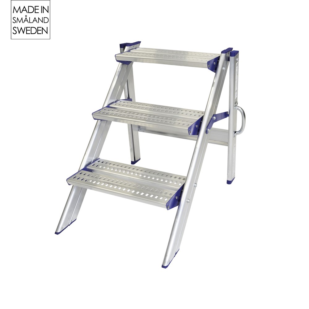 Contacteer onsInklapbaar werkbordes met grote, opengewerkte, anti-slip treden van 45 x 25 cm voor meer stacomfort. Ideaal voor montage en werken aan machines, voor stukadoors ivm de opengewerkte treden en voor verhuis en transportbedrijf als toegangstrap voor de trailer. Zeer compact in te klappen en makkelijk mee te nemen met behulp van draaghendel.