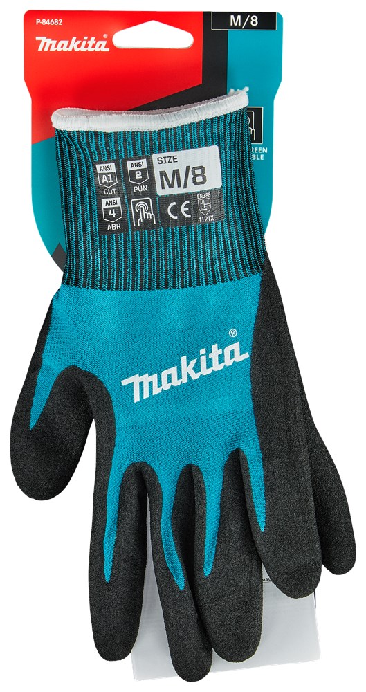 Contacteer onsComfort-handschoenen. Hoogwaardig rundsleer met verstevigde handpalm. In overeenstemming met EN 420, EN388 CE-CAT II, Level 2132. Deze Makita werkhandschoenen bieden zowel flexibiliteit als uitstekende behendigheid in de vinger- en polsgebieden. Dankzij hun nitrilcoating op de handpalm hebben ze extra grip. Bovendien zijn ze touchscreen-compatibel. Deze handschoenen zijn ideaal voor een breed scala aan toepassingen, waaronder algemeen onderhoud en reparaties, werk in de scheepvaart en magazijnen, lichte bouw, productie, automotive en doe-het-zelf projecten. Ze zijn tevens bestand tegen olie en vloeistoffen en kunnen in de machine worden gewassen. Voldoen aan de norm EN388 4121X.