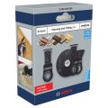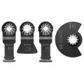 De vloer- en montageset bevat duurzame oscillerende multitool bladen voor het zagen van hout, laminaat en zachte metalen en voor het verwijderen van mortel en tapijtlijm van vloeroppervlakken.