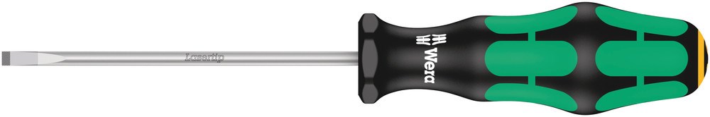 Hoogwaardige Kraftform Plus-schroevendraaier met kling voor elektriciens. Meervoudige Kraftform Plus-handgreep om prettig en ergonomisch verantwoord te kunnen werken en blaren en schuurplekken te voorkomen. Harde gripzones voor een hoge werksnelheid, zachte gripzones voor een hoge draaimomentoverdracht. De punt van Wera Lasertip-schroevendraaiers wordt met laserstralen microscopisch fijn opgeruwd. Dit ruwe oppervlak ‘bijt’ zich letterlijk vast in de schroefkop. Onbedoeld wegglijden behoort zo tot het verleden. "Take it easy"-toolfinder met kleurcodering op profiel en maatcode – voor het eenvoudig en snel vinden van het benodigde gereedschap. Zeskantige wegrolbescherming verhindert telkens wegrollen op de werkplek.