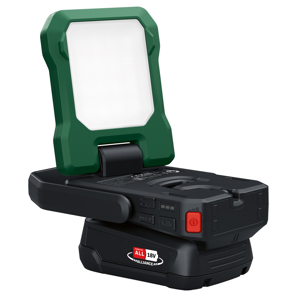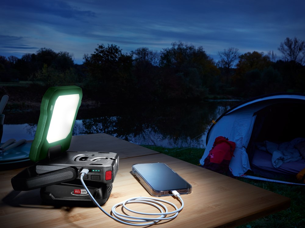 Multifunctioneel LED-licht: werkplaats, buiten, kamperen. Voor beter kamperen, buiten eten of verlichting bij doe-het-zelfklussen is de EasySpotLight 18V-400 de ideale oplossing. Met een helder licht van maximaal 400 lumen, helderheidsinstelling in drie standen en instellingen voor warm/koud wit licht kan deze lamp snel worden aangepast aan de sfeer en klus. Deze is gemakkelijk te dragen en vast te houden dankzij de handgreep en het flexibele ontwerp, en is uitgerust met krachtige magneten en een haak voor bevestiging. De beweegbare kop van de lamp kan 180° gekanteld en 360° gedraaid worden om te zorgen voor nauwkeurige verlichting waar dit nodig is. Dit LED-licht doet ook dienst als USB-C© powerbank, zodat smartphones en andere apparaten onderweg kunnen worden opgeladen. Het gereedschap maakt deel uit van het 18V POWER FOR ALL-systeem. Eén accu kan worden gebruikt voor alle 18V POWER FOR ALL-gereedschappen.