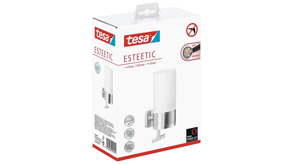 Contacteer onsDe fraaie tesa® Esteetic zeepdispenser is artistiek vervaardigd van de beste materialen en heeft een afgerond vierkanten ontwerp en een roestvrijstalen oppervlak. Het matglas vult de andere materialen perfect aan. De hendel van de pomp zit aan de onderkant van de houder en is eenvoudig met één hand te gebruiken. De dispenser is bevestigd met een zelfklevende oplossing in plaats van te boren. Muren en tegels worden dus niet beschadigd. Je kunt het accessoire netjes en snel verwijderen en elders plaatsen met adapter BK20. tesa.Power.Kit Glue: Let op! Bij gebruik kunnen gevaarlijke inhaleerbare stofdeeltjes worden gevormd. Stof niet inademen.
